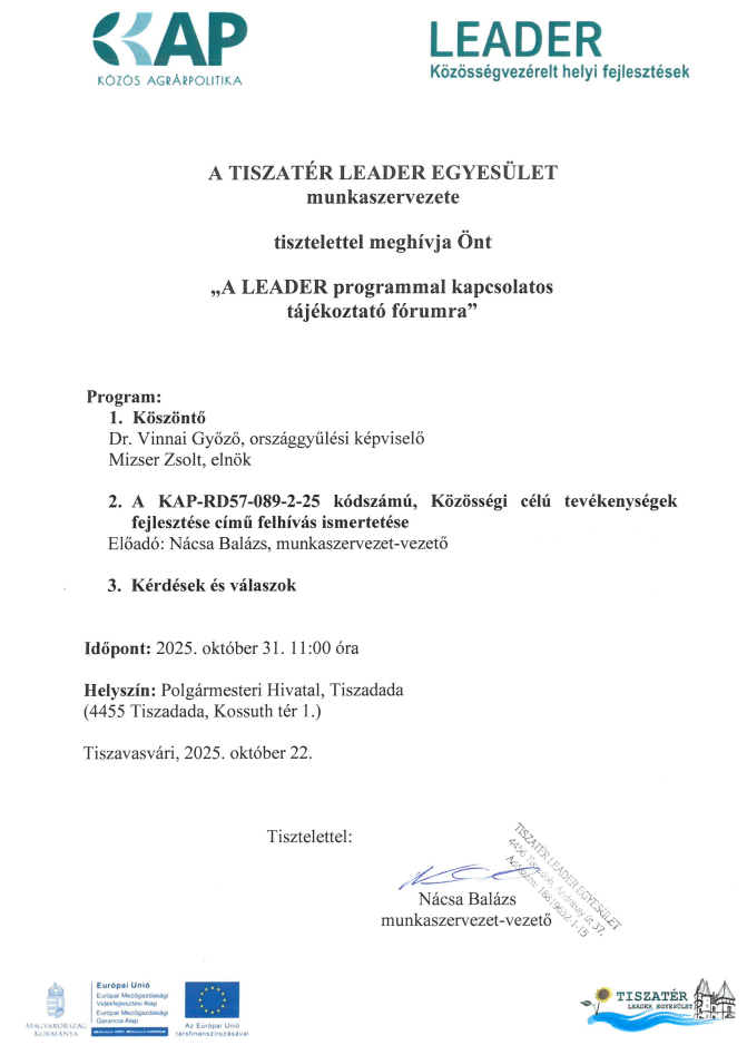 Üdvözlettel: TISZATÉR LEADER Egyesület munkaszervezete